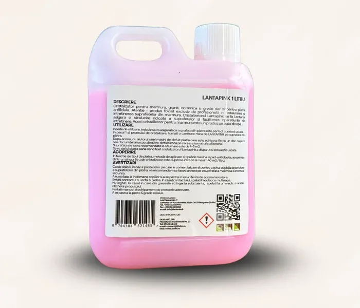 Cristalizator pentru marmura, granit, ceramica si gresie dar si pentru piatra artificiala. Atentie - produs folosit exclusiv de profesionistii in restaurarea si intretinerea suprafetelor din marmura. Cristalizatorul Lantapink de la Lantania asigura o stralucire ridicata a suprafetelor si faciliteaza operatiunile de intretinere. Acest cristalizator pentru marmura este un produs pe baza de apa.