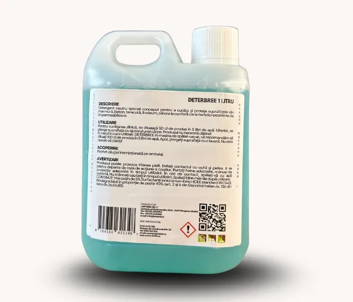 Detergent neutru creat special pentru curatarea si protectia suprafetelor din marmura, beton, terrazzo si linoleum, carora le confera proprietati excelente de impermeabilizare. Deterbree formeaza o bariera protectoare impotriva apei, facilitand astfel intretinerea pardoselilor si a rosturilor. Curata eficient si protejeaza, lasand in acelasi timp un parfum placut.